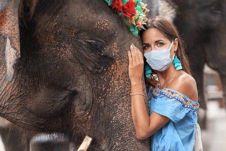 Novices or monks hug elephants. Novice Thai standing and big elephant with forest background. , Tha Tum District, Surin, Thailand.