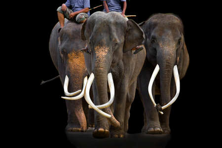 Mahout and student little asian in uniform are raising elephants on walkway in forest. Student little asian girl and boy singsong with him elephant, Tha Tum District, Surin, Thailand.
