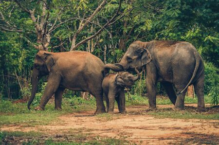 Wild elephant family eating small trees and bushes in green grass field of tropical rainforest on sunny day, Thailand.