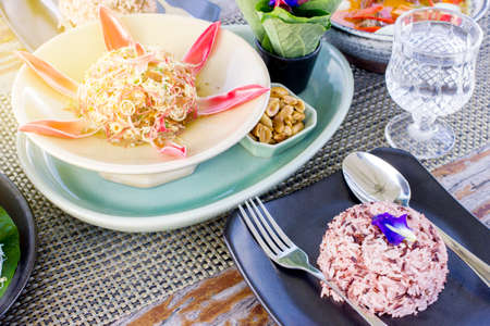 Traditional local cuisine set thai fusion food served on table with cutlery set or flatware tableware in modern dining room for guest customer eat drinks at luxury restaurant cafe in Bangkok, Thailand