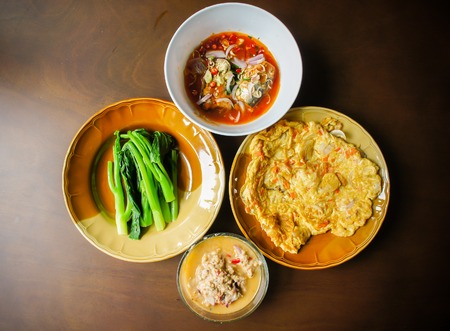 Thai local homemade street food set on wooden table. top view. Red curry with Thai omelet and Num Prik chilli sauce