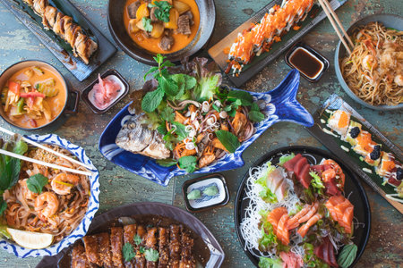 Varied Asian food. Famous Asian cuisine dishes on the table. Top view. The concept of a Thai restaurant. Asian style banquet