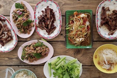 Traditional Thai spicy papaya salad, Grilled pork and fresh vegetable on wooden plate