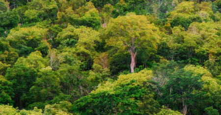 breathtaking dense tropical forest with rich flora lush bushes and high trees against white sky and bright morning sunlight