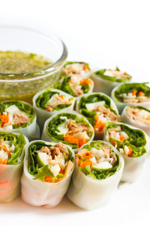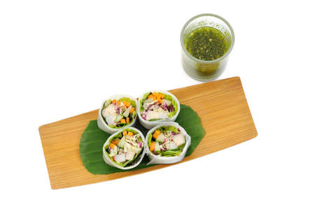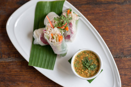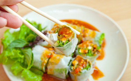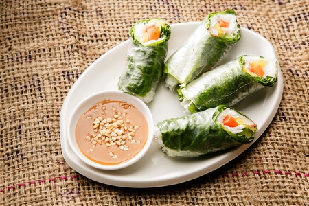 Southeast Asian cuisine fresh meat roll with spicy fish sauce