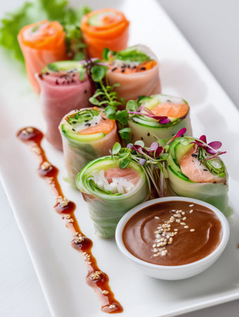 High-angle professional shot of fresh rice paper rolls filled with raw salmon, cucumber, and microgreens. Served with a thick savory dipping sauce garnished with sesame seeds on a white plate.