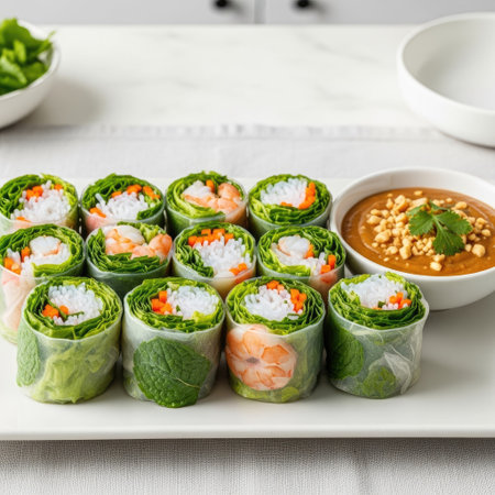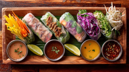 A vibrant assortment of fresh Vietnamese spring rolls served on a wooden platter, accompanied by flavorful dipping sauces and garnishes, perfect for healthy dining ideas.