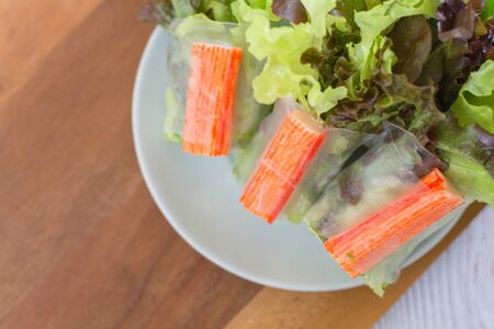 Salad roll with crab stick, carrot, cucumber and lettuce wrapped with rice paper on dish eating with dipping sauce