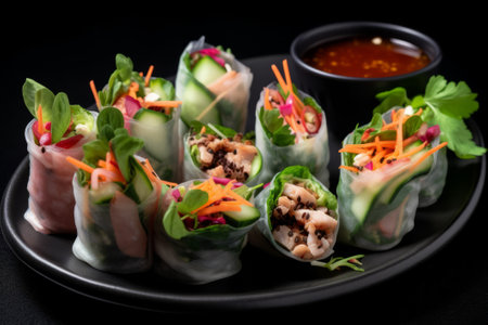These fresh vegetable spring rolls showcase a colorful array of ingredients wrapped in rice paper, served with a savory dipping sauce on a rustic slate surface.