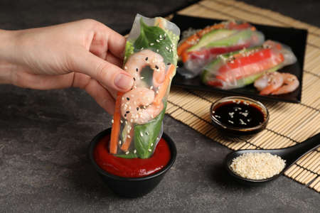 Woman dipping roll wrapped in rice paper into sauce at gray table, closeup
