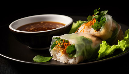A Taste of Vietnam: Goi Cuon - Fresh herbs peek through translucent rice paper, inviting a delicious dip in rich peanut sauce. AI-generated