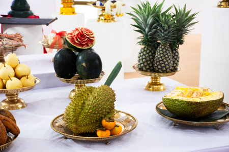 Traditional rite sacrificial offering sweet dessert snack variety fruits food drinks for respect blessing to holy buddha deity angel god mystery worship in Ayutthaya, Thailand