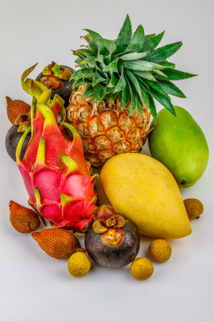 Exotic fresh summer fruits on white background. Dragon fruit, pineapple, persimmon, mango, annona cherimola flat lay with free copy space.