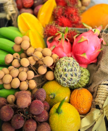 Exotic and tropical fruits on the market of Asia, Thailand, Vietnam. Mini bananas, longan, pitaya, Dragon Fruit, papaya.