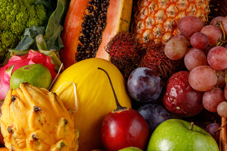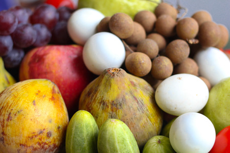 Close up of exotic fruit: passion, dragon, annona, anona, lime, rose apple
