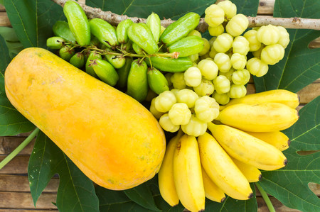 Pile of fresh Thai tropical fruit, green mango, yellow mango, pineapple, longan, jackfruit on table with bright biege wood wall background