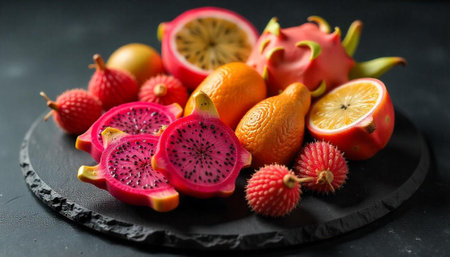 Tropical fruit charcuterie dessert grazing platter on wooden board, dark background, top view.