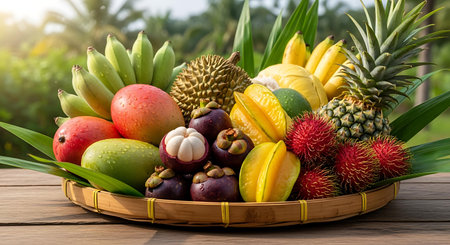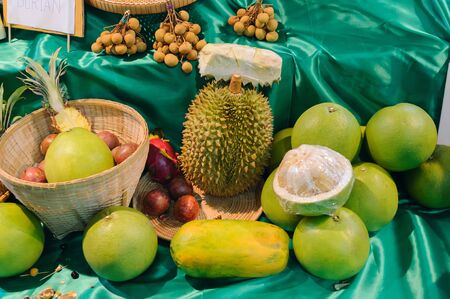 Fresh tropical fruits lay out on green background. Exotic fruits on asian market.