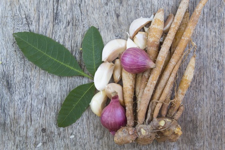 Flat lay of Thai herbal with wood background