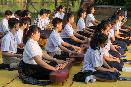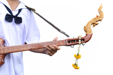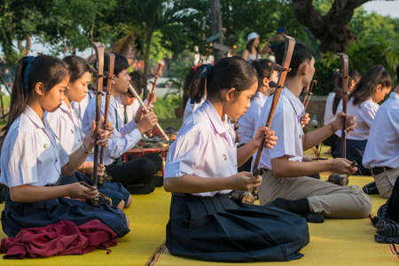Studen artist playing Phin stringed plucked instrument Thai culture