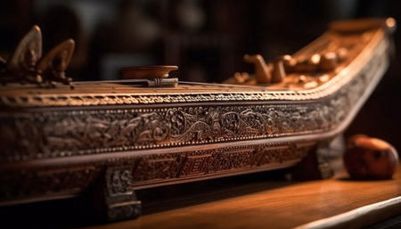 Explore the beauty of finely crafted wooden instruments displayed elegantly, featuring detailed carvings and unique designs, illuminated by natural light for a warm ambiance.