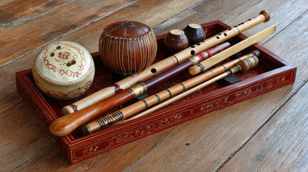 Small Thai instruments arranged in a decorative tray on wood floor for display