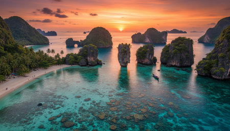 Serene tropical beach at sunset with emerald sea, limestone karsts and a traditional longtail boat reflecting vibrant sky hues over calm water and sandy shore in krabi