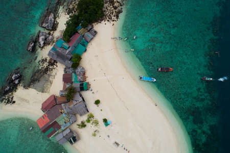 Aerial view drone camera Top down of Amazing small island beautiful tropical sandy beach landscape scenery view at koh Khai Island in Phuket Thailand