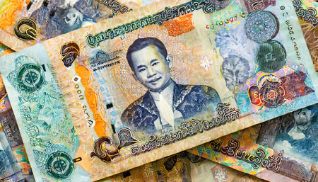 Cambodian money, paper currency. One thousand Riel bill, with the image of King Norodom Sihanouk on it, on top of other cambodian banknotes.