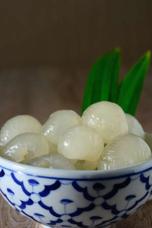 Longan in syrup and pandan leaf on wooden background. Traditional thai dessert.