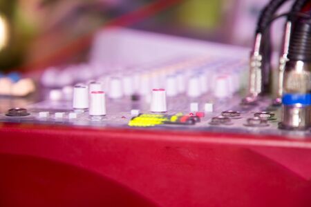 Close-up buttons equipment for sound mixer control. Mixer for musician DJ and sound engineers. Mixing DJ remote with colorful neon light. Night club, nightlife concept