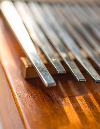 Warm afternoon sunlight catches the polished metal tines of a traditional wooden kalimba, waiting to be played.