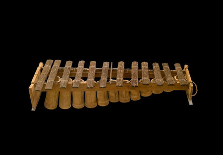 A traditional wooden Thai musical instrument, ranat ek, resembling a xylophone is played with mallets seen from directly above