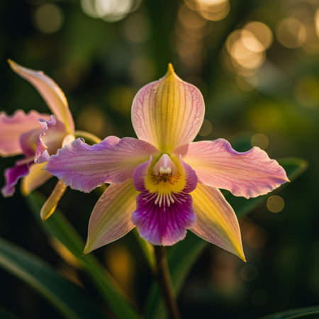 Beautiful orchid flower in the garden at sunset time. Natural background.