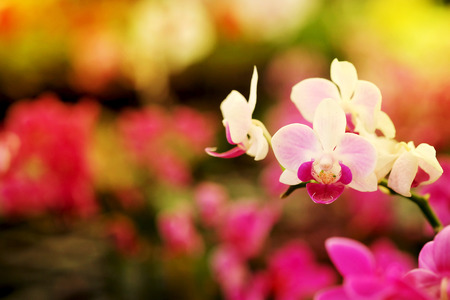 Close up Blooming beautiful Mini pink Phalaenopsis orchid in colorful flower garden with soft focus background