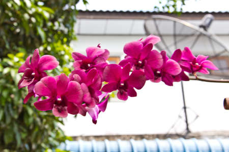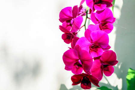 magenta orchid blooming in garden and wihte wall background