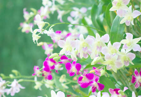 beautiful pink bouquet orchids flower with leaf green background in farm