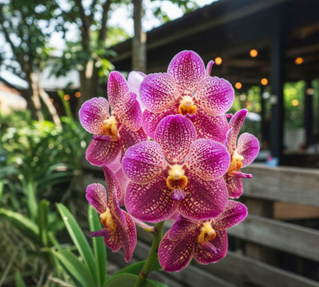 A cafe in Thailand is decorated with Vanda orchids, both native and new hybrid varieties.