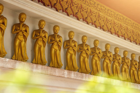 Row of golden Buddha statues, each in a praying posture, situated in an ancient Thai temple