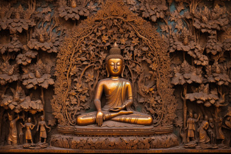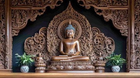 A stunning Buddha statue in a peaceful position is framed by elaborate floral carvings, creating a tranquil atmosphere perfect for meditation and reflection.
