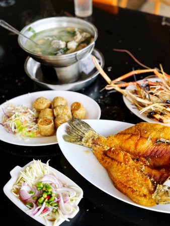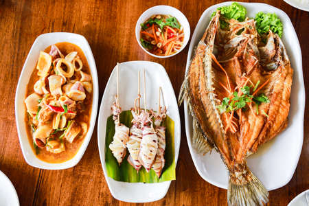 Top view of Thai Seafoods are Grilled Prawns (Shrimps) in the shell, Steamed crabs, grilled Laevistrombus Canarium, Grilled Squid and Deep Fried Sea Bass with Sweet Fish Sauce and Mango Salad.