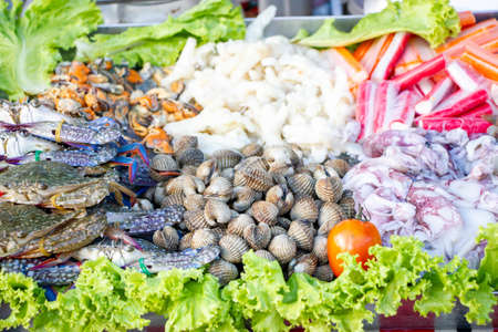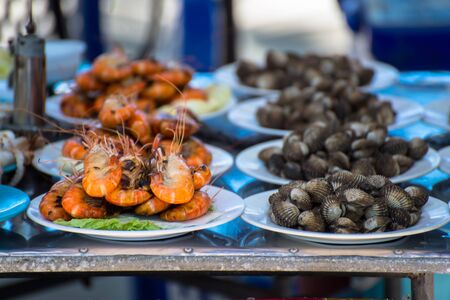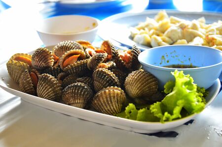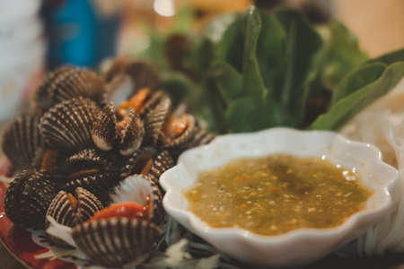 seafood fish market Blood cockle, Green mussel closeup, selective focus