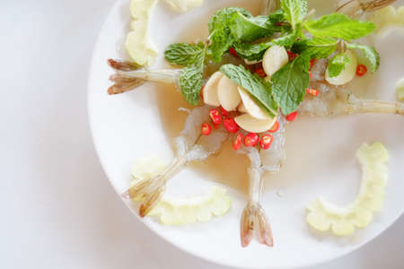 Ready streamed large fresh prawns in heart shape and spicy sour herb served on wood