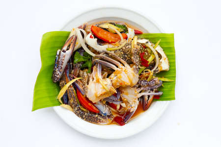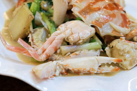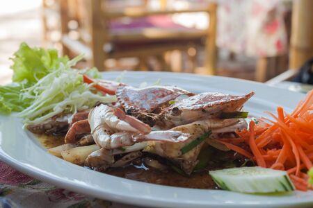 Stir fried crab with black pepper on white dish, Sea food, Thai food.