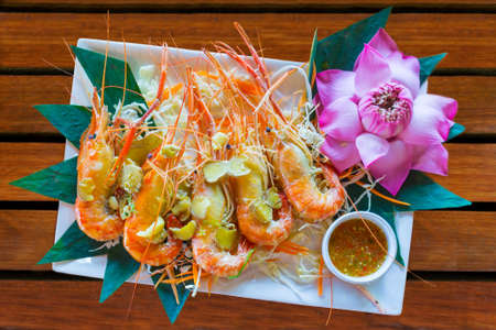 Grilled giant river prawn in a Thai luxury restaurant. Seafood in Thailand. Grilled giant river prawn served on a plate with Thai seafood sauce. Thai cuisine. Grilled giant shrimp on a dinner table.