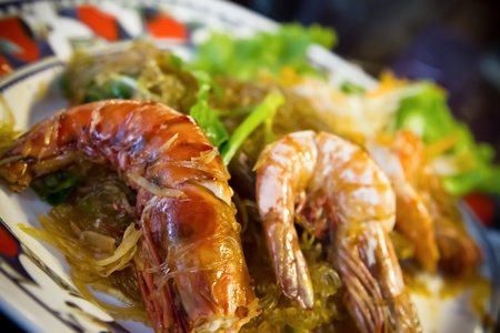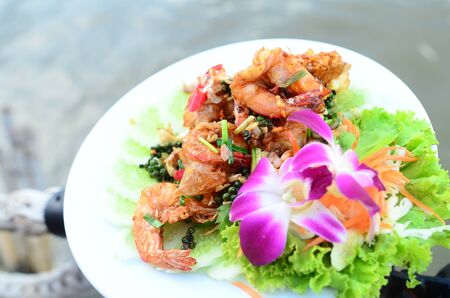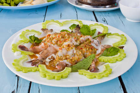 salmon and shrimp salad , spicy salad or spicy seafood salad for serve
