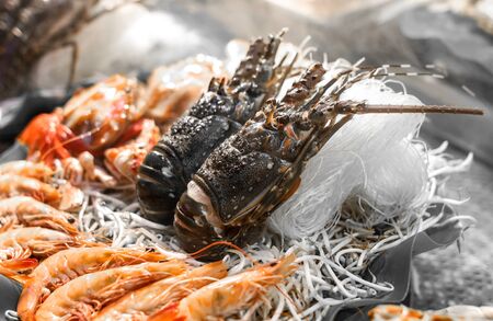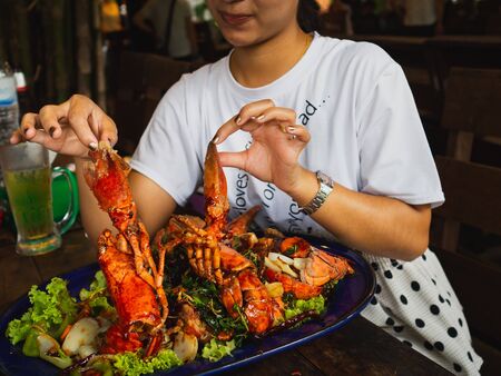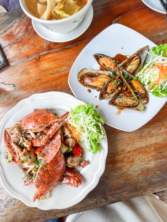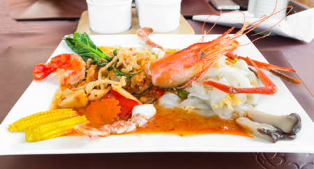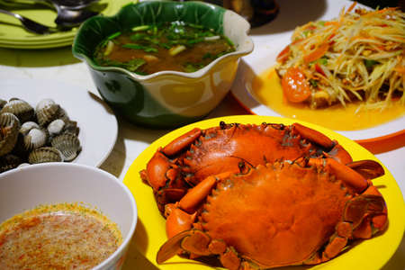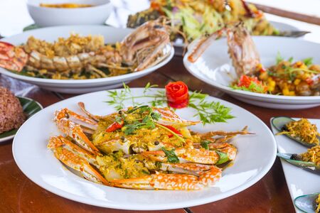 Dishes with various seafood at dinner table, selective focus,mantis shrimp,Fried crab with curry powder.