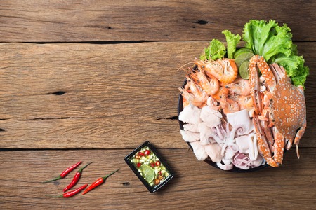 seafood mixed with spicy sauce on wooden background crab shrimp squid and fish in plate