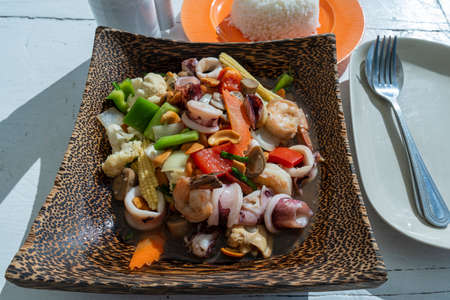a Thai food Seafood fried in a spicy sauce in white circle dish on wooden table background.