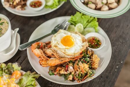 Grilled giant river prawn (shrimps) with spicy seafood set on wooden table at Ayutthaya Thailand - homemade food concept.